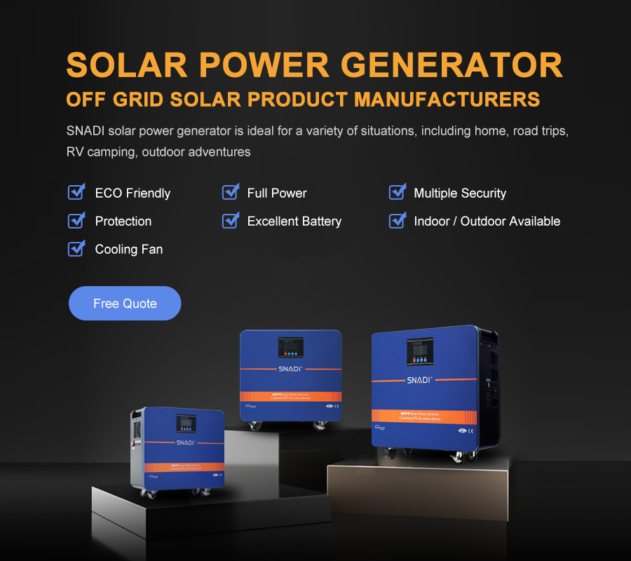 مولد الطاقة الشمسية هو نظام محمول ومكتفي بذاته يتضمن جميع المكونات الضرورية لتوليد وتخزين الطاقة الشمسية. ويتكون عادةً من لوحة شمسية وبطارية ووحدة تحكم بالشحن وعاكس، وكلها موجودة في وحدة واحدة. عندما تكون الكهرباء مطلوبة، يقوم العاكس بتحويل كهرباء التيار المستمر المخزنة في البطارية إلى كهرباء تيار متردد، والتي يمكن استخدامها لتشغيل الأجهزة والأجهزة. يتضمن مولد الطاقة الشمسية الكل في واحد عادةً منافذ ومنافذ USB لتوصيل الأجهزة. مولد الطاقة الشمسية هو وسيلة مريحة وصديقة للبيئة لتوليد وتخزين الطاقة الشمسية. وهي محمولة وسهلة الاستخدام ويمكن أن توفر الطاقة في الأماكن النائية أو أثناء انقطاع التيار الكهربائي، ومناسبة لمختلف المناسبات.